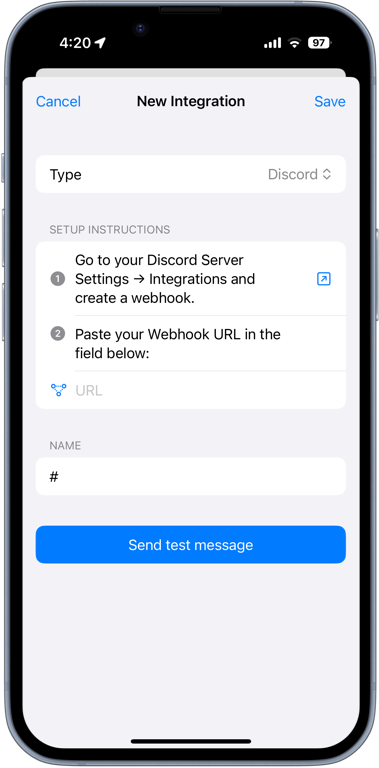 Once your Webhook is ready, create a new Discord destination in Forward SMS. Copy and paste the Webhook URL from the previous step.