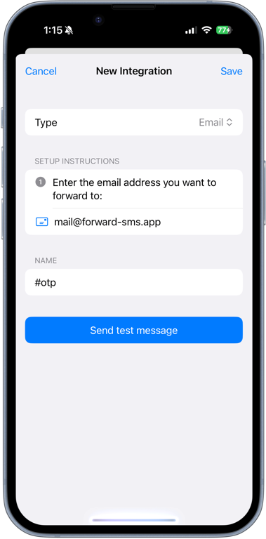 Open the Forward SMS app and create a new email destination. Enter the email address you want to forward your messages to, then tap Save.
