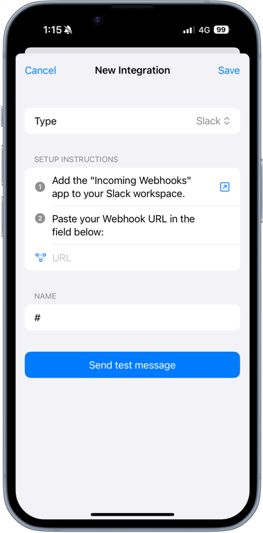Test if everything is set up correctly by tapping Send test message and checking if a message arrived in Slack.