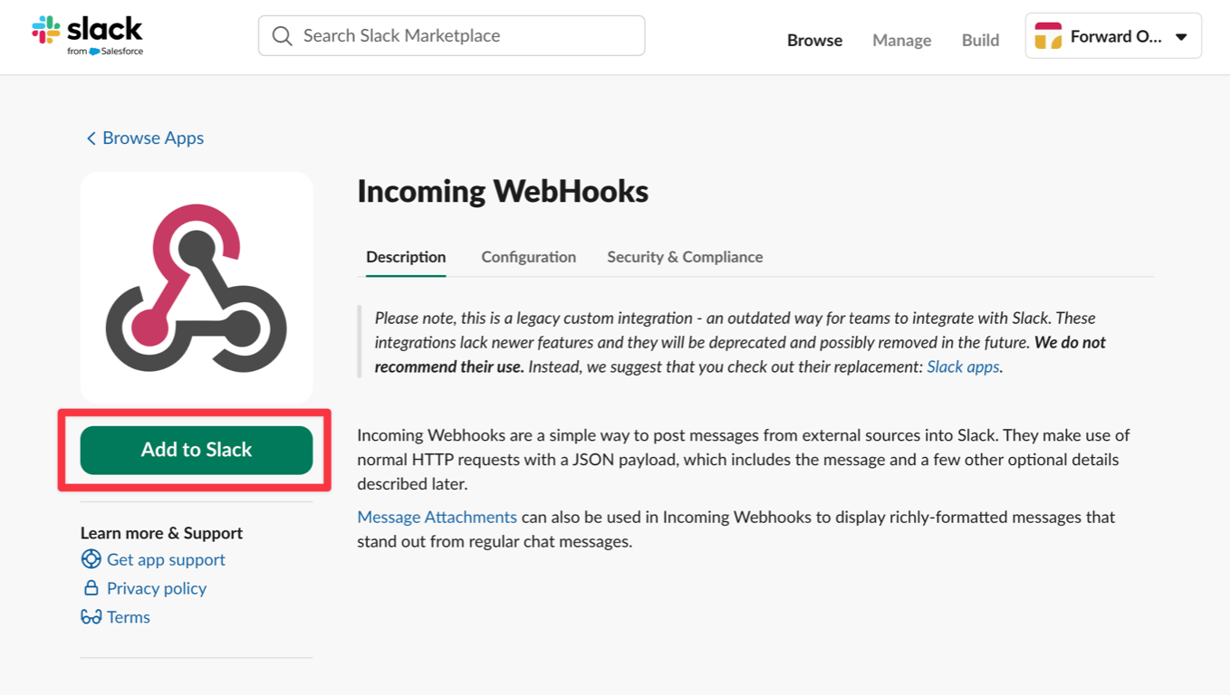 Last, copy your Webhook URL from the setup instructions. You’ll need this URL in the next step to configure the Slack integration in Forward SMS.