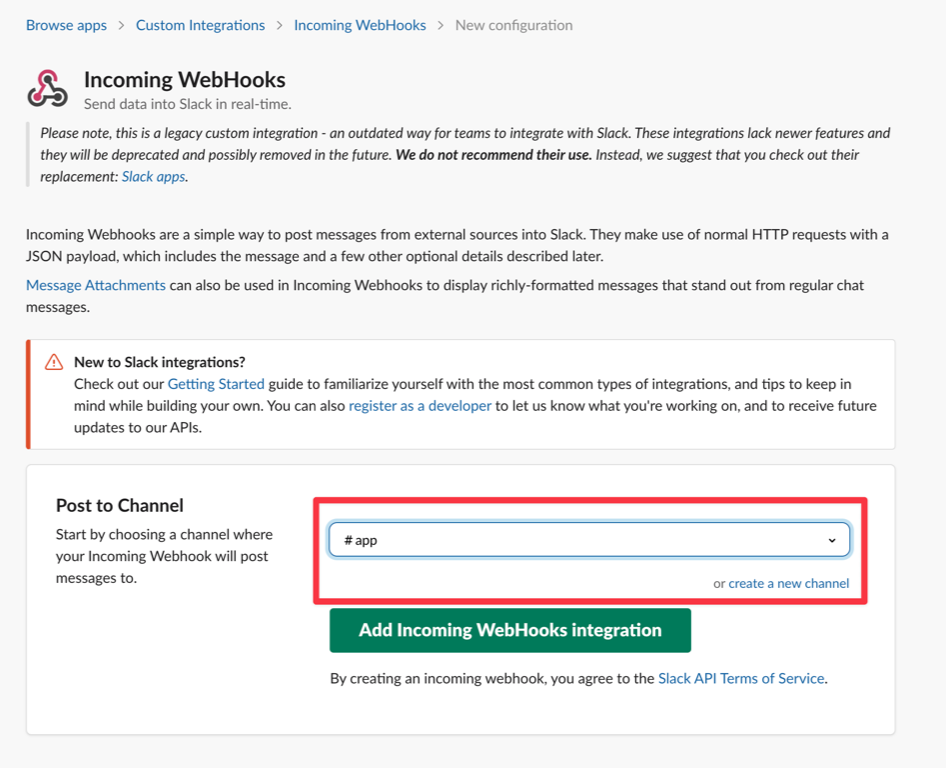 Choose the channel or person where you want to forward the messages, then click Add Incoming WebHooks Integration: