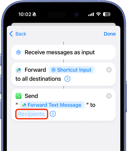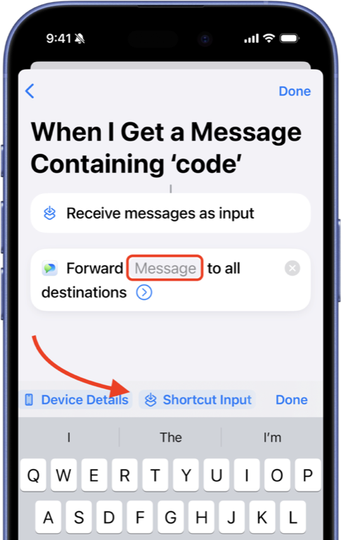 Tap the Message field in the Forward SMS action. Scroll to the right on the toolbar above the keyboard and select Shortcut Input to use the incoming message as input.