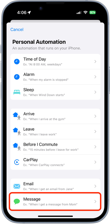Tap Create Personal Automation and select the Message trigger from the list of options.