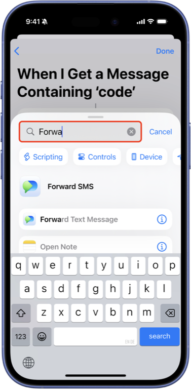 After setting up the trigger, tap Next and then tap Add Action. Search for the "Forward SMS" action and select it to add it to your automation.