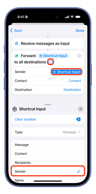 - Set Sender to Variables > Shortcut Input