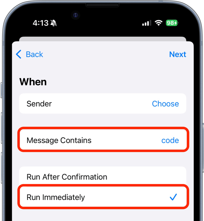 Use the Sender or Message Contains option with a keyword like "code" to forward a category of texts, like codes or notifications.
